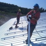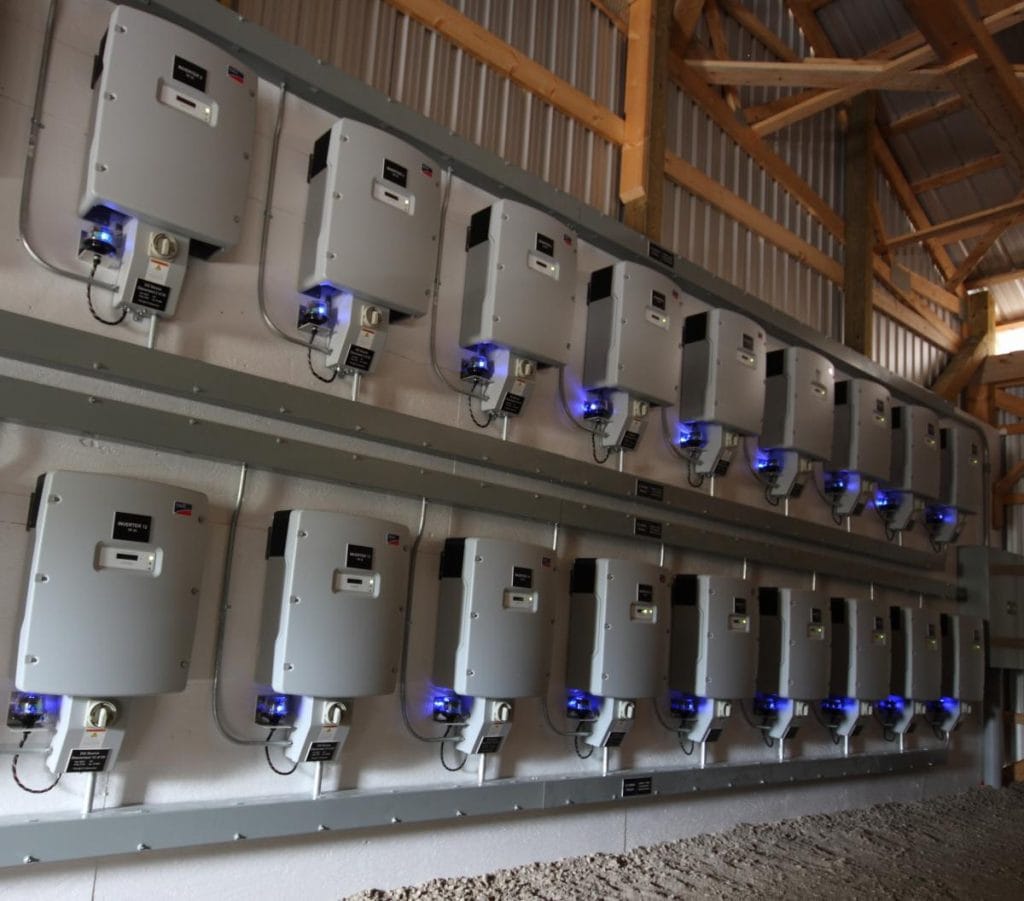 This 9300sq ft drive shed in Bailieboro was designed from the beginning as a dual purpose structure to store farm equipment and support a solar array on its roof. The optimized mono-slope roof design and the barn’s south-facing orientation maximize the amount of solar exposure. A 125kW solar array and 100kW SMA string inverter bank combine to produce a super-barn that does a lot more than just keep the equipment dry. The finished product is a multi-purpose building producing a long term income stream for its owners.