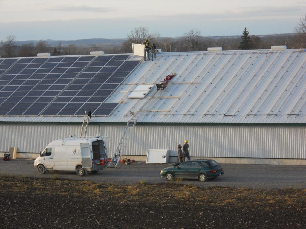 These two barns near Bailieboro host a mix of storage, future livestock, and a 250kW FIT solar energy system. The system was split between two buildings and we opted for an array of twenty five 10kW inverters feeding a 600VAC 3 phase farm service. This array of string inverters offers increased reliability and serviceability through redundancy.