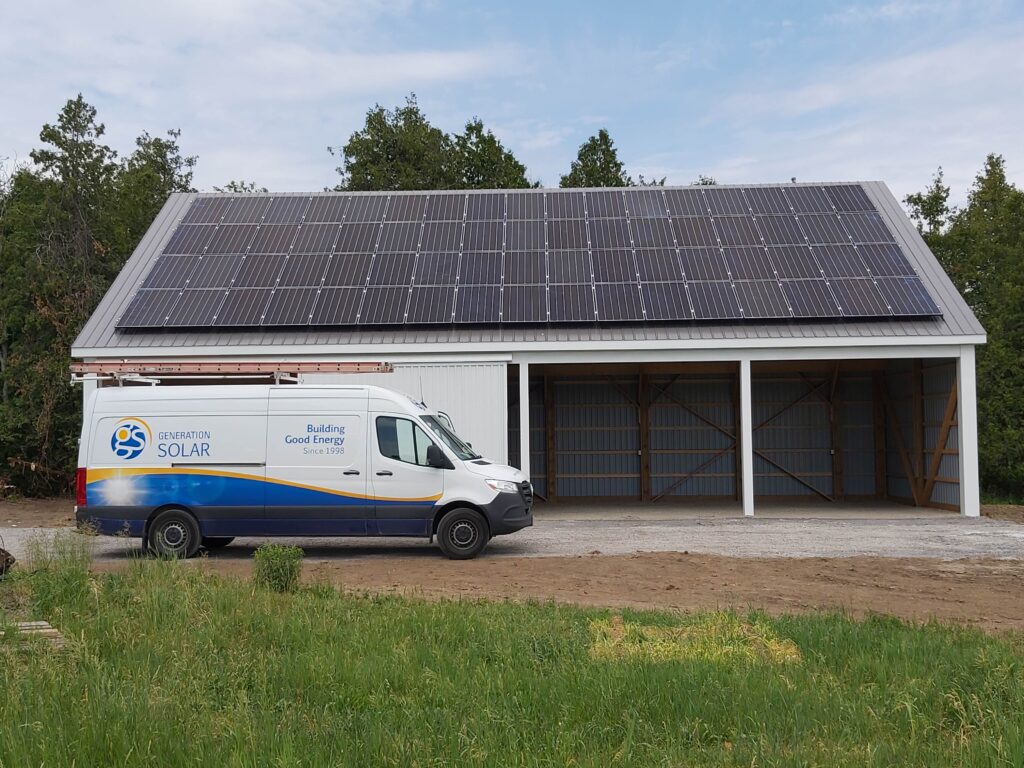 To get one step closer to the clients’ goal of net zero, Generation Solar designed and installed a PV plus storage system. Mounted on a mono-slope drive shed specifically designed to maximize solar exposure, the net metered system incorporates lithium battery backup to keep the lights on during any grid outages. Since growing needs are a real possibility, we designed the whole system to be expandable: both inverter and battery capacity can be easily increased to provide a full 100A of backup service for the entire house, garage and drive shed.